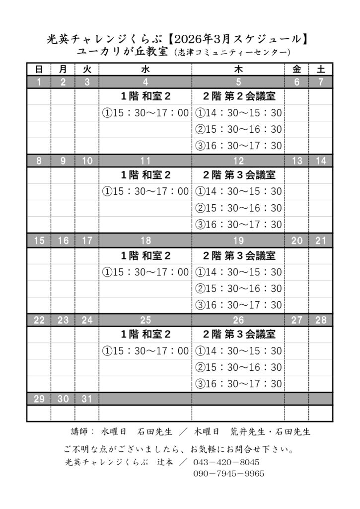 桃の花がほころぶ季節となりました。卒業や進級を控え、心も新たにする3月です。3月の教室スケジュールをお知らせいたします。ご確認ください。 お知らせ ユーカリが丘教室 よかったらシェアしてね! URLをコピーしました! URLをコピーしました! コメント コメントする コメントをキャンセルコメント ※ 名前 ※ メール ※ サイト 次回のコメントで使用するためブラウザーに自分の名前、メールアドレス、サイトを保存する。