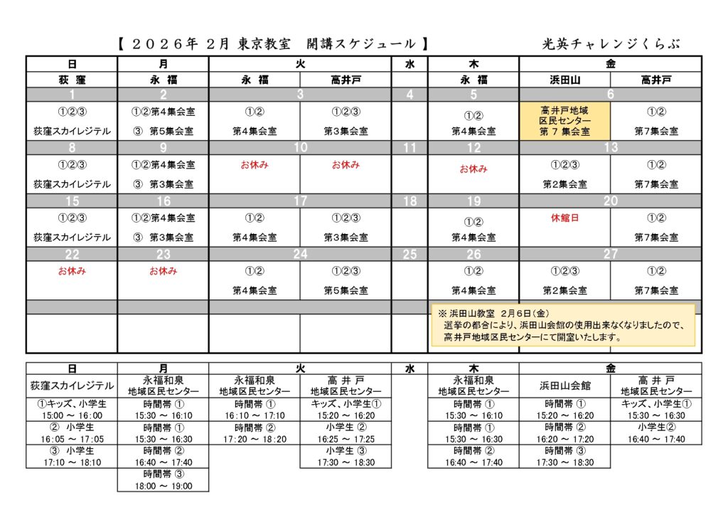 東京教室 2026年2月開室スケジュール
